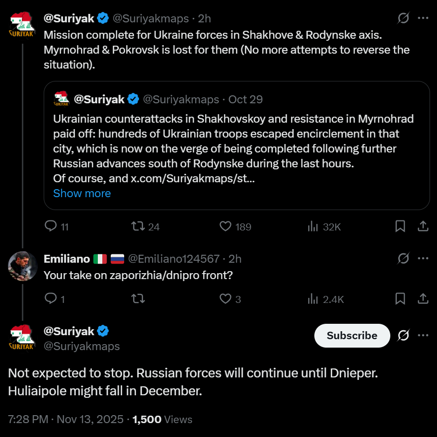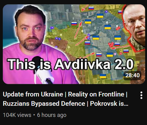 >Front reports: Battle for Krasnoarmeysk; the 2nd Army completed mopping up operations of Sukhoi Yar, Battle for Dimitrov; the 51st guard and 5th motor rifle brigade began an offensive on Vostochny neighborhood, Battle for Kupyansk; the 6th Army resumed the liquidation of entrapped elite ukrainian units, Battlegroup East continued to advance deep into enemy territory in Zaporozhye - https://archive.today/giqsc