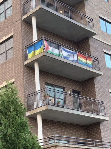 >The Russian flag hangs in a building in the southern part of Volchansk