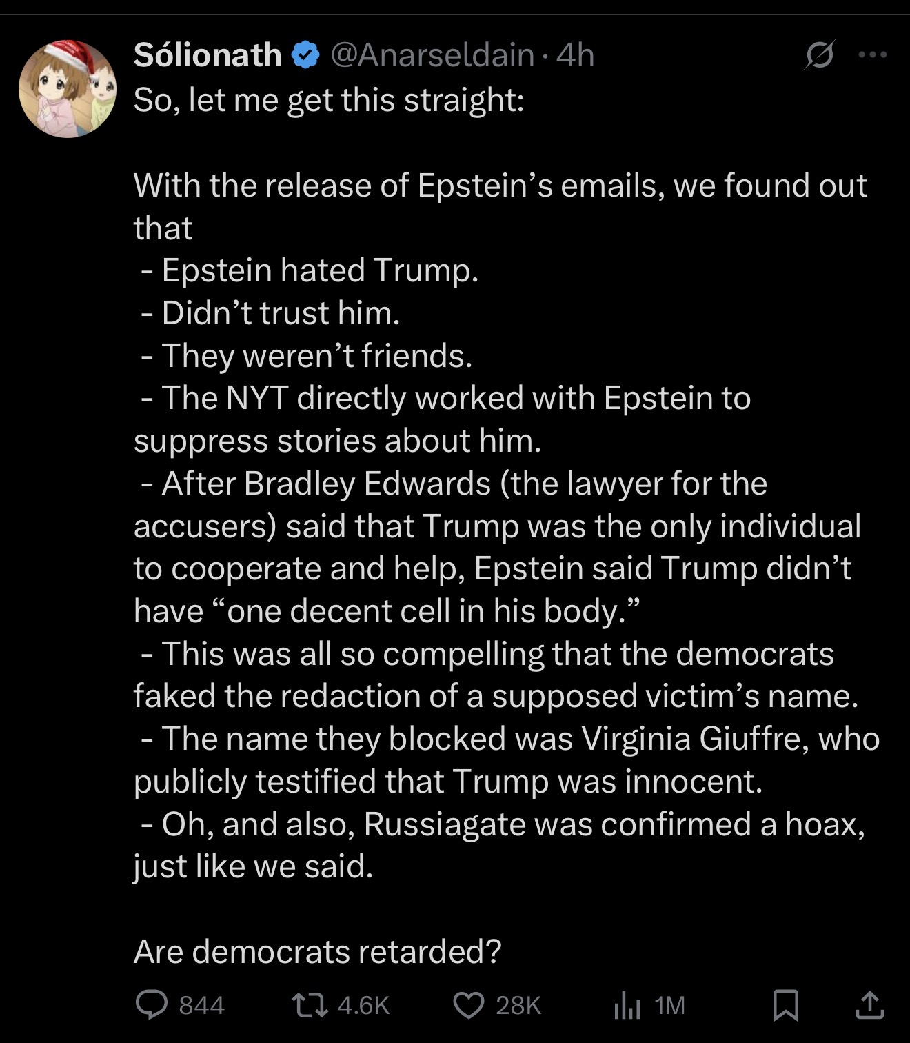 >release everything related to epstein!>OK>*drops over 20000 additional correspondences that do nothing but further clear Trump's already cleared name*>TRUMP ISN'T INCRIMINATED IN ANY OF THESE! KEEP RELEASING FILES UNTIL YOU FIND SOMETHING!
