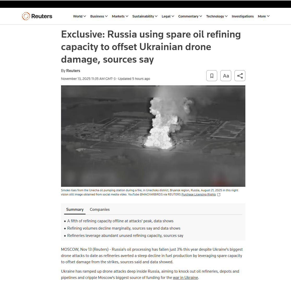 >Russia's oil processing has fallen just 3% this year despite Ukraine's biggest drone attacks to date as refineries averted a steep decline in fuel production by leveraging spare capacity to offset damage from the strikes, sources said and data showed. — Reuters>The three industry sources told Reuters that Russian refineries were running well below full capacity before the attacks and were able to mitigate their impact by restarting spare units at both damaged and unaffected plants as well as putting back into operation the attacked units after repairs. Russia has total refining capacity of around 6.6 million bpd, but industry sources say it is rarely fully utilised.>More broadly, from January to October, oil processing fell to around 220 million metric tons (5.2 million bpd), down 3% from last year.The sources spoke on condition of anonymity due to the sensitivity of the issue.