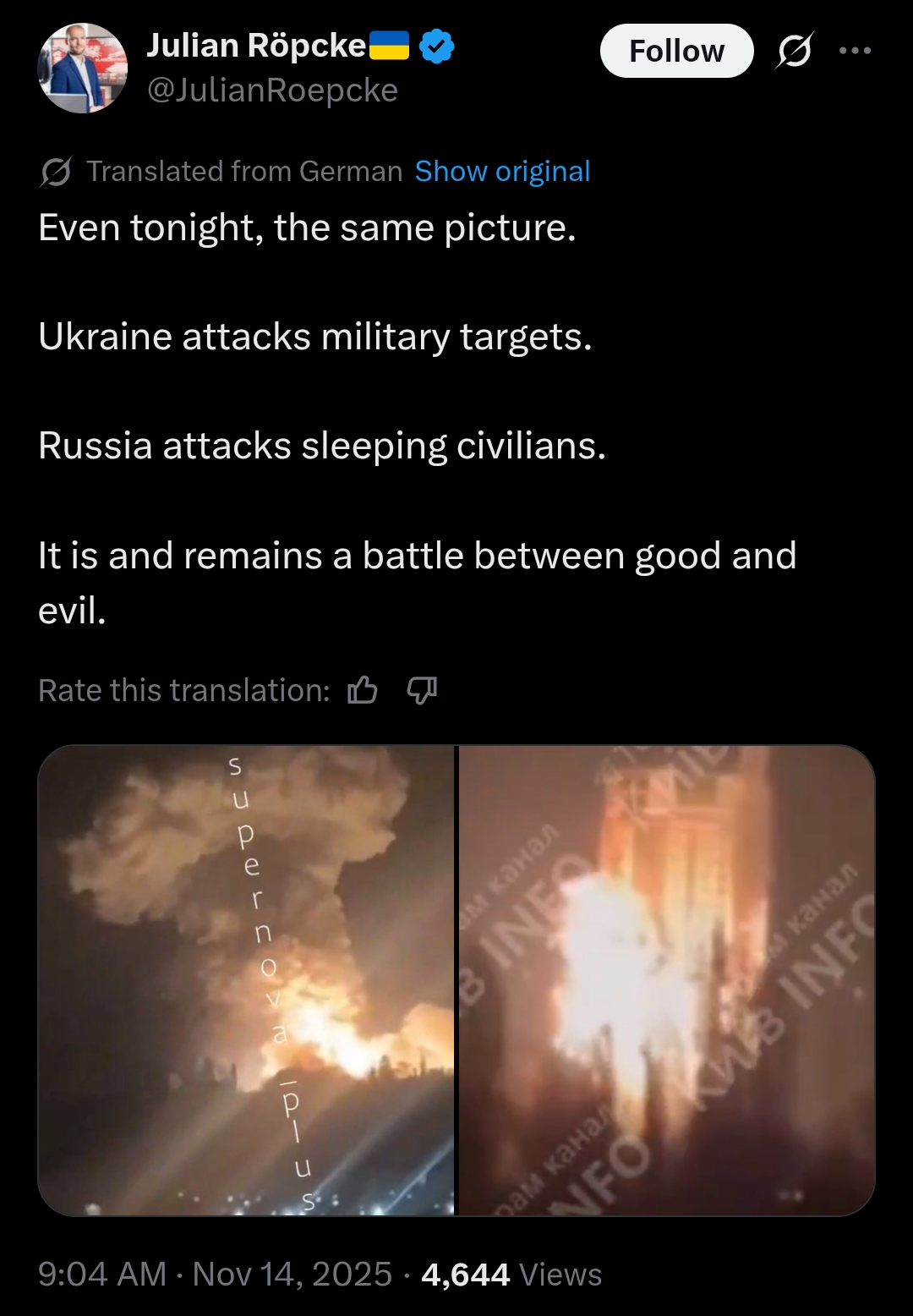 https://x.com/JulianRoepcke/status/1989227940228350248>Even tonight, the same picture.>Ukraine attacks military targets.>Russia attacks sleeping civilians.>It is and remains a battle between good and evil.damn war criminals strike again
