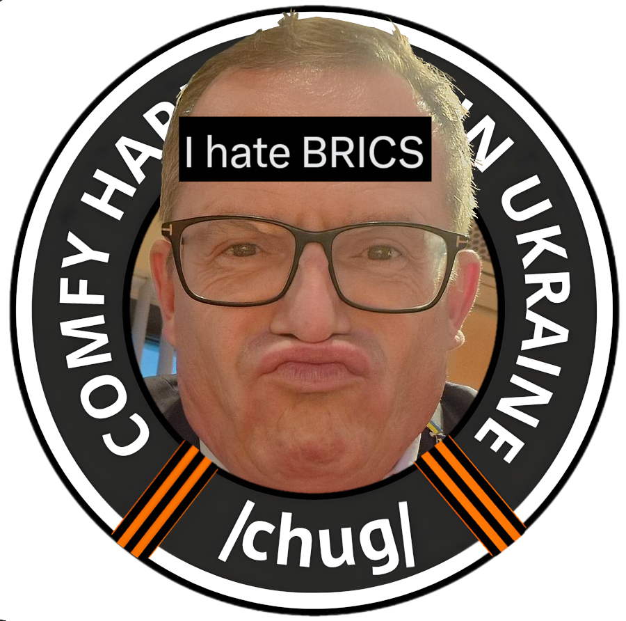 >>521379886BRICS>Brazil: Sends hundreds of mercenaries to Ukraine every>Russia: Laughing stock of the group, serves as cheap oil>India: Lol, nothing more to say>China: Vital part of Ukraine's drone system, contributes significantly toward dead Russians>South Africa: Starving and always begging