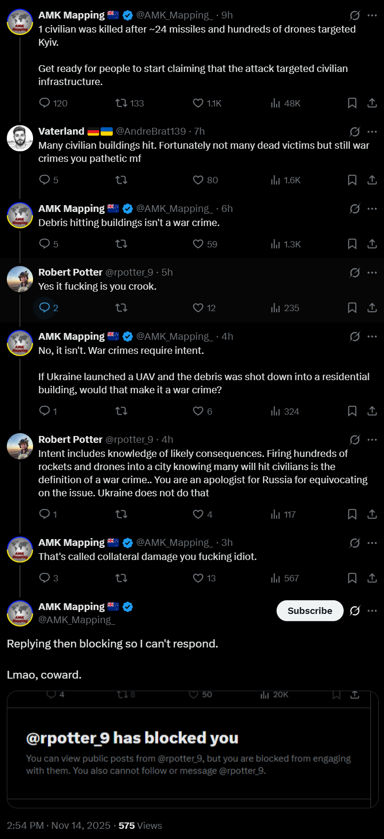 >>521385184I was pro-Ukraine at the start of the war (had been talking to a Ukrainian girl, she seemed nice for a gold-digger). But after seeing how subhuman they continue to act it’s impossible.I realize they’ve been heavily propagandized into rabid dogs, but that doesn’t change the solution.Unfortunately the cowards and children of the elite were allowed to escape, so I fear the worst will be left alive to commit terrorist acts against the world for decades to come.