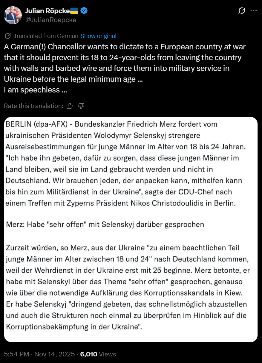 https://x.com/JulianRoepcke/status/1989361319095775670>A German(!) Chancellor wants to dictate to a European country at war that it should prevent its 18 to 24-year-olds from leaving the country with walls and barbed wire and force them into military service in Ukraine before the legal minimum age ... >I am speechless ...
