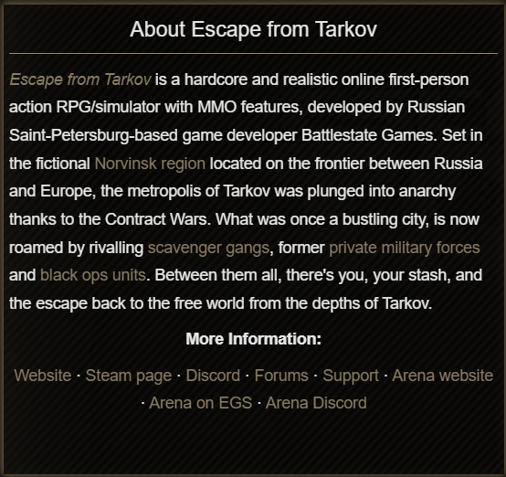 >>521388199Kek. Couple of thing tho. 1st, really recommend you play PVE version of it first. It's in the bottom right part of the main menu. 2nd it isn't really made like a typical game as in there's a whole bunch of game mechanics that aren't explained in the game itself in any way or form so drop this link into the bookmarks https://escapefromtarkov.fandom.com/wiki/Escape_from_Tarkov_Wiki you really gonna need it. And 3rd the game's optimized as absolute ass. Of it get totally dogshit frames in locally host raids try to the "use bsg servers" button in the map choice menu. Would take some additional time matching but you'll get some of those frames back.