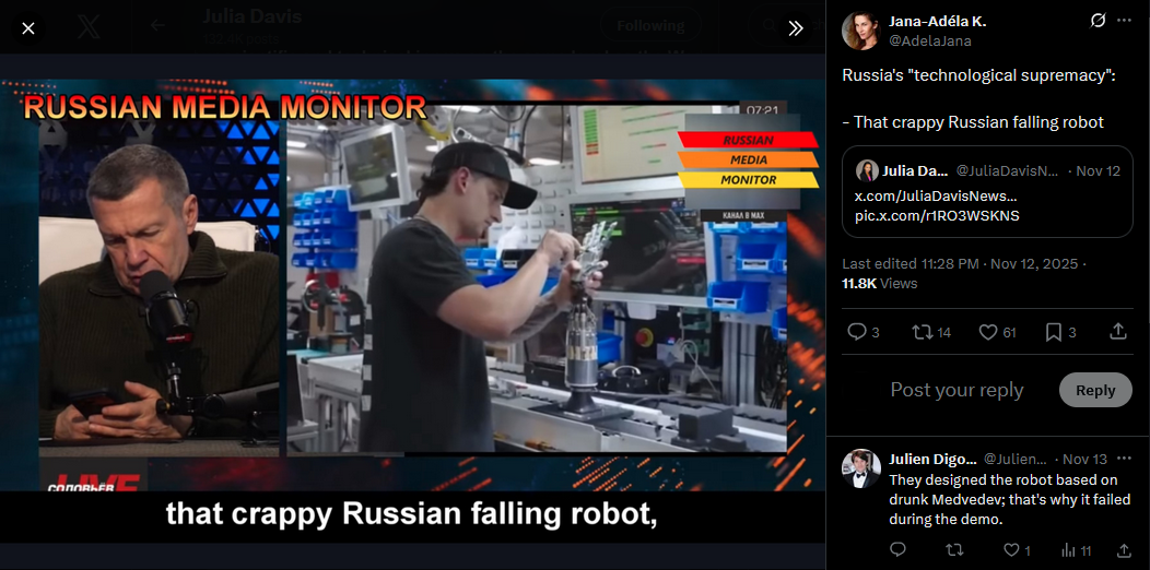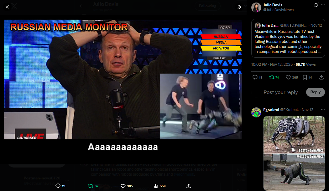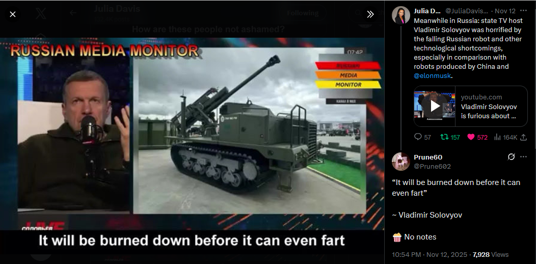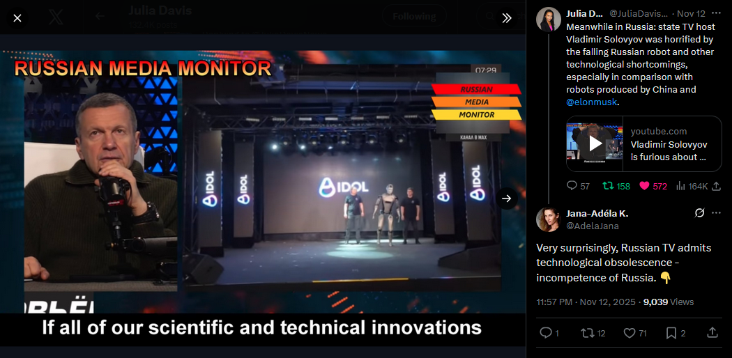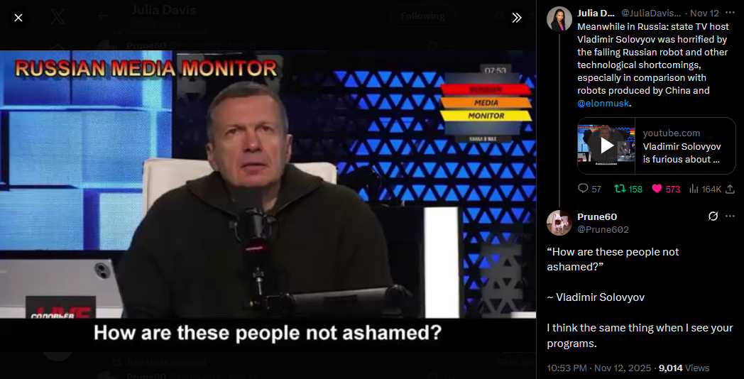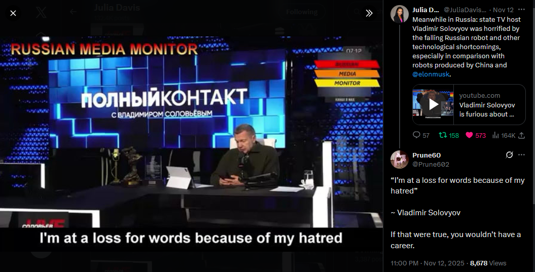 Meanwhile in Russia: state TV host Vladimir Solovyov was horrified by the falling Russian robot and other technological shortcomings, especially in comparison with robots produced by China and @elonmuskhttps://x.com/JuliaDavisNews/status/1988727826871402838?s=20https://www.youtube.com/watch?v=jhv4grZvh0E&list=PLLWQyEN3YRo41QwWb7e8J5YjBX80WmGtG