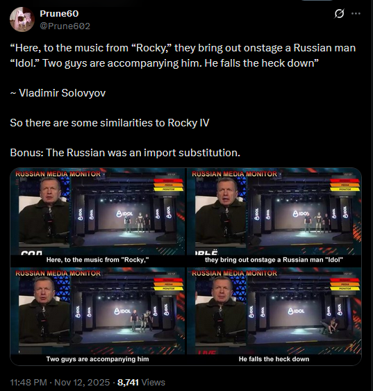 >>521415949“Here, to the music from “Rocky,” they bring out onstage a Russian man “Idol.” Two guys are accompanying him. He falls the heck down”~ Vladimir SolovyovSo there are some similarities to Rocky IV Bonus: The Russian was an import substitution.https://x.com/Prune602/status/1988755919770198367?s=20