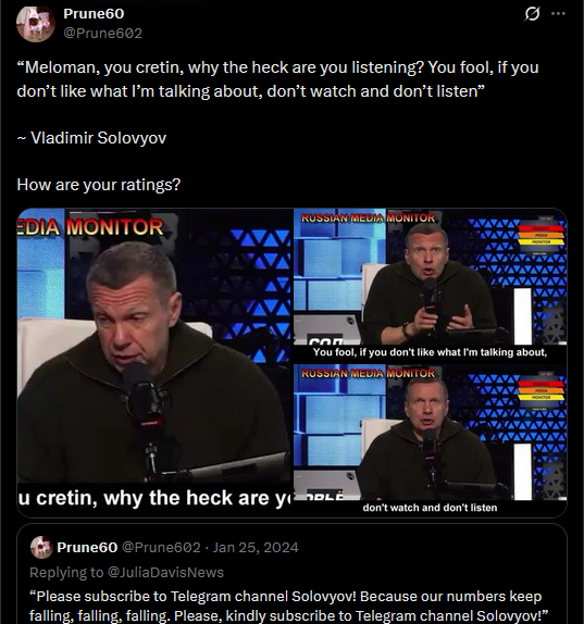 >>521415949“Meloman, you cretin, why the heck are you listening? You fool, if you don’t like what I’m talking about, don’t watch and don’t listen”~ Vladimir SolovyovHow are your ratings?https://x.com/Prune602/status/1988764714332025107?s=20
