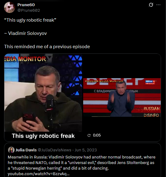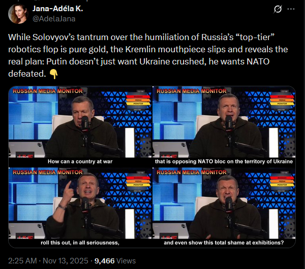 >>521415949While Solovyov’s tantrum over the humiliation of Russia’s “top-tier” robotics flop is pure gold, the Kremlin mouthpiece slips and reveals the real plan: Putin doesn’t just want Ukraine crushed, he wants NATO defeated. https://x.com/AdelaJana/status/1988795436388508031?s=20