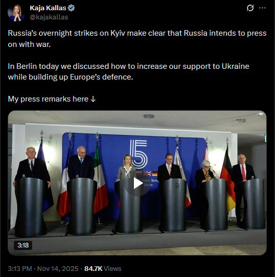 Russia’s overnight strikes on Kyiv make clear that Russia intends to press on with war.In Berlin today we discussed how to increase our support to Ukraine while building up Europe’s defence. My press remarks here https://x.com/kajakallas/status/1989350890034110805?s=20https://files.catbox.moe/s9vxdr.mp4