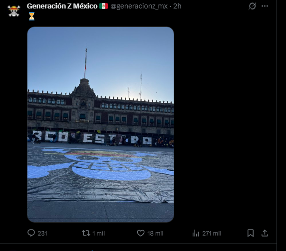 >>521486405A bunch of faggots marched and gathered in Palacio Nacional (Mexican White House) with One Piece flags because they say Sheinbaum is a "narco-President" and also becasue they are angry for the murder of a Mayor. Nothing happened, some got sprayed n shit