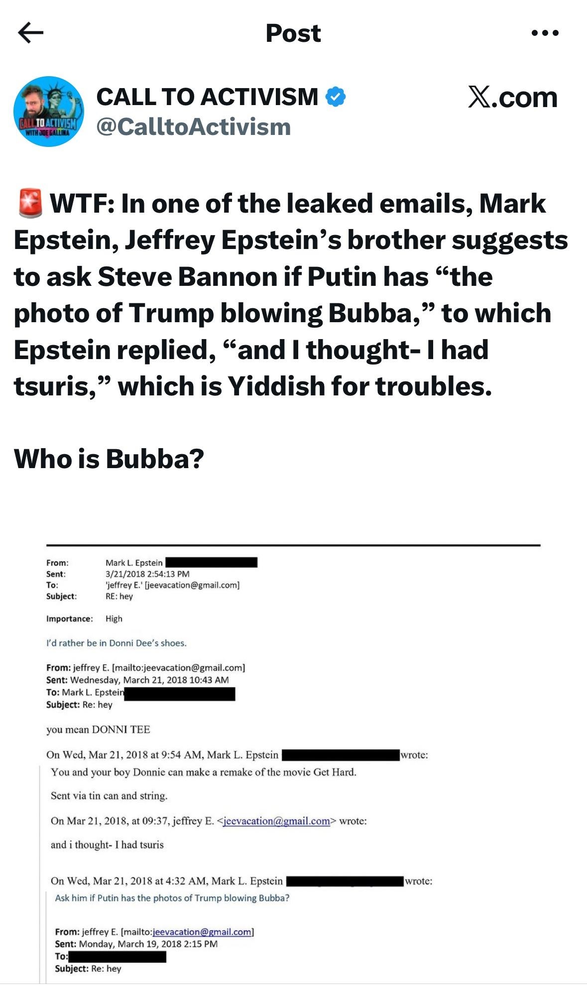 https://www.rawstory.com/jeffrey-epstein-2674299704/>“For the avoidance of doubt, the reference to ‘Bubba’ in this correspondence is not, in any way, a reference to former President Bill Clinton,” Mark Epstein said in an apparent statement, shared by Shamsian on social media late Saturday.>“Any attempt to conflate that reference with President Clinton, or to read sweeping implications onto them, misrepresents both the purpose and the tone of the original correspondence. I want to be absolutely clear on this point so that the public record is not distorted and so that speculation does not unfairly implicate people who are not actually being referenced in those communications.”>Mark Epstein went on to dismiss his 2018 comments as “simply part of a humorous private exchange between two brothers” that was “never meant for public release,” though ultimately did not clarify who “Bubba” referred to.There goes that story.