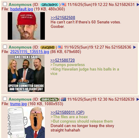 Wait, I thought there were no files or maybe they were just a hoax? The dems never released the files because Trump's name wasn't in the files? So the dems edited Trump's name into them right as they were about to lose power just to make Trump look bad which is why the files couldn't be released under Trump? So Trump disavowed his base because they wanted the non-existent* (*fake) hoax edited files with his name in them (maybe) being released because it was all 4D chess leading up to this exact moment? Now the files are definitely confirmed to exist (again?) and the dems have fallen into Trump's trap? The dems didn't realize supporting the Epstein file release would backfire on them despite having knowledge and access to the files for years under Biden (which is when the dems could have destroyed the evidence against them) but instead they faked a few files by adding just Trump's name in them because they are so stupid? SO MUCH WINNING!