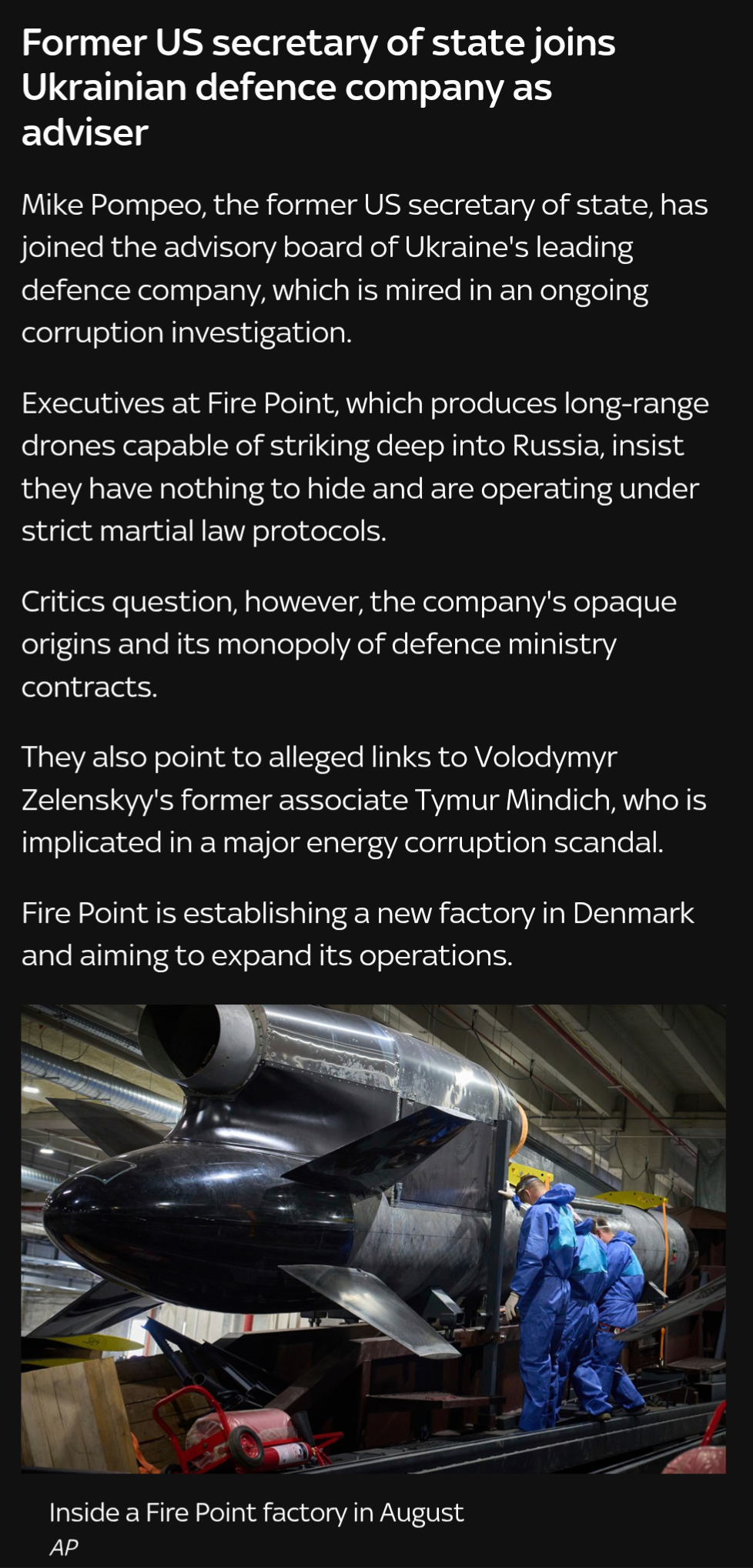 Mike Pompeo, Trump's neo-cohen ex secretary of state, is joining the board of corrupt Ukrainian drone manufacturer fire point, manufacturer of the ethereal "flamingo" long distance drone.The company has been siphoning off billions from European taxpayers.