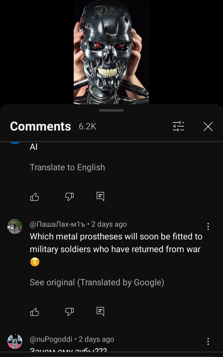>the first comment i see on 1:1 terminator model>it's in Ukrainian>it's about amputated soldiers with robot prostheticsWhy... why am i surprised