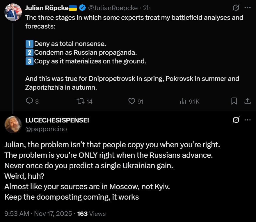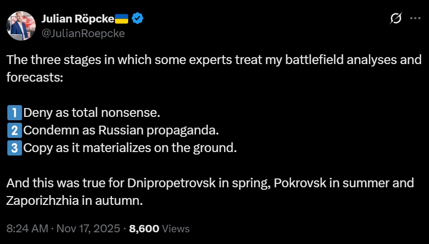 https://x.com/JulianRoepcke/status/1990304987961078080>The three stages in which some experts treat my battlefield analyses and forecasts:>1. Deny as total nonsense.>2. Condemn as Russian propaganda.>3. Copy as it materializes on the ground.>And this was true for Dnipropetrovsk in spring, Pokrovsk in summer and Zaporizhzhia in autumn.