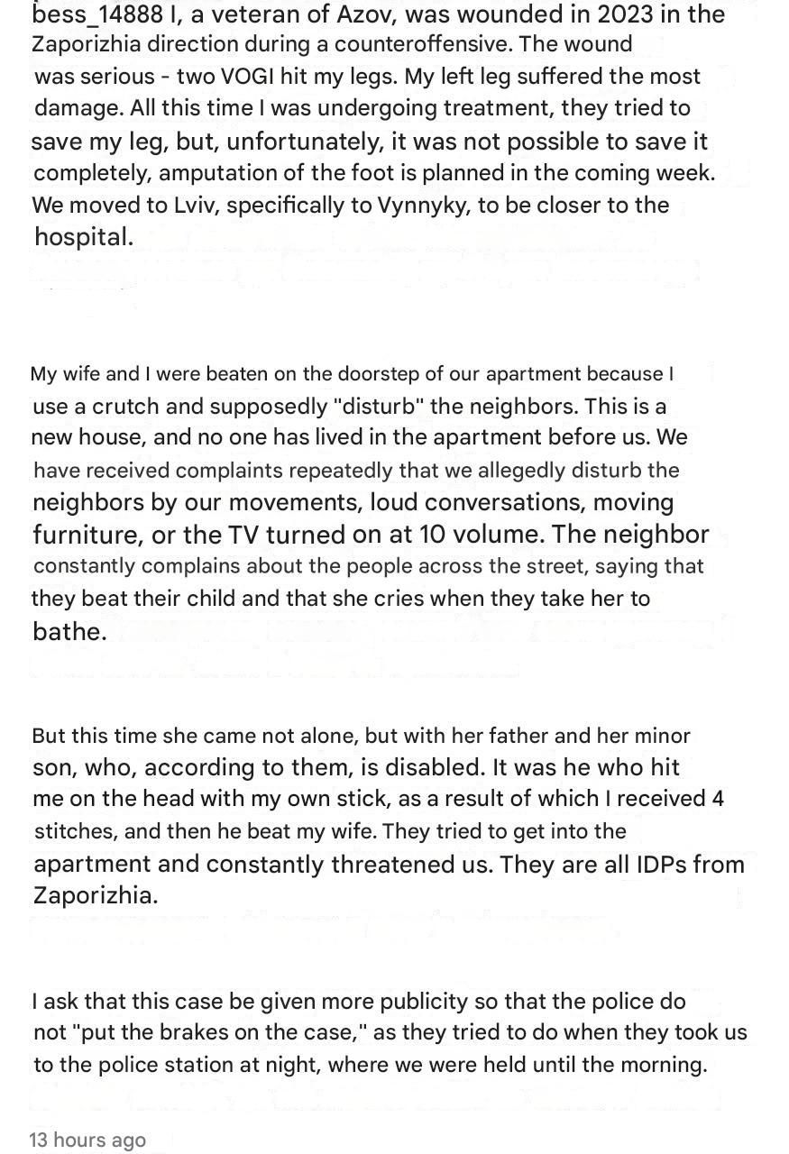 >>521601767>but this time she didnt come alone but with her father and son who according to them, is disabled>It was he who hit me on the head with my own stick>result of which I received 4 stitches>and then he beat my wifeI couldnt come up with something like this even if I tried