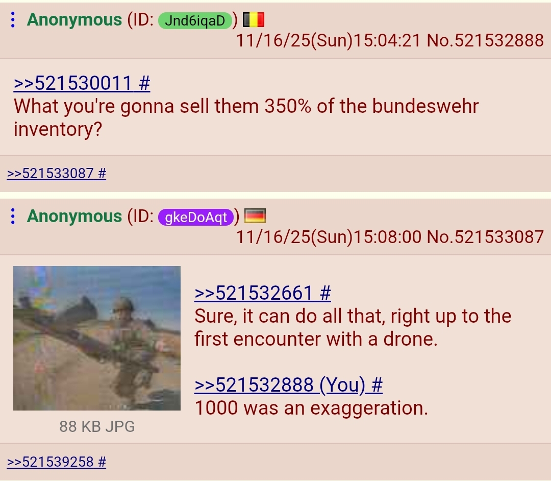>>521601557>last 1 gets shot down by Air Defense thinking it was a Russian SU-25 conducting a sortieand gets shilled in chug as ukranny destroying 100 su37s