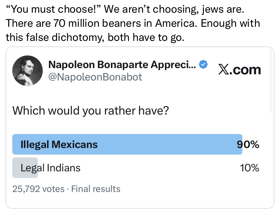 >>521663733Self deportation is the answer. Remove of birth right citizenship I also a key aspect to success. Cut them off from any and all social services. Seize all assets acquired though illegally living in the United States. They will leave on their own.This will be hard tho, once the boomers finally die off, we can target the jews and women within institutions orchestrating this invasion.