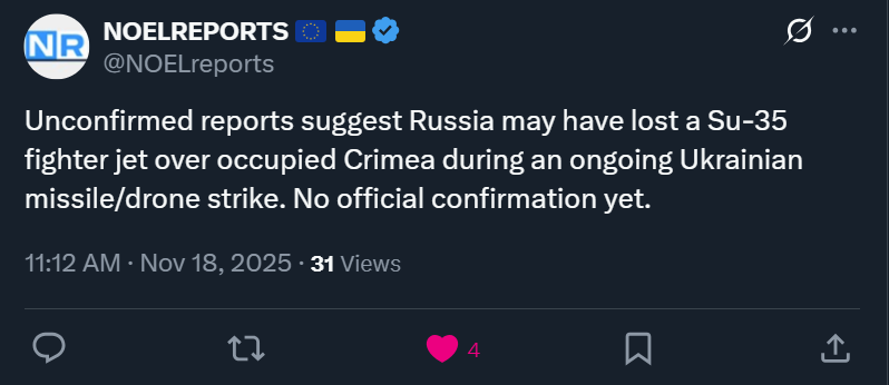 Collaborator Denis Pushilin confirmed that Ukrainian drone strikes left 500,000 subscribers without power in occupied Donetsk, Makiivka, Horlivka, and Yasynuvata. A large part still remains without power.https://x.com/NOELreports/status/1990355480263471479?s=20>yesterday