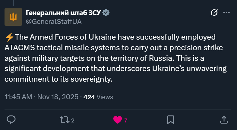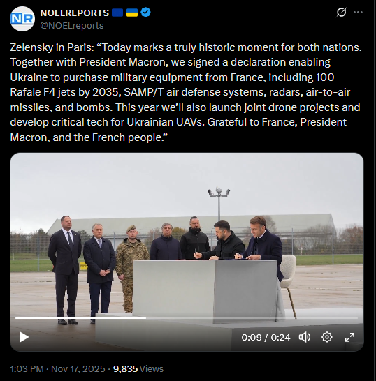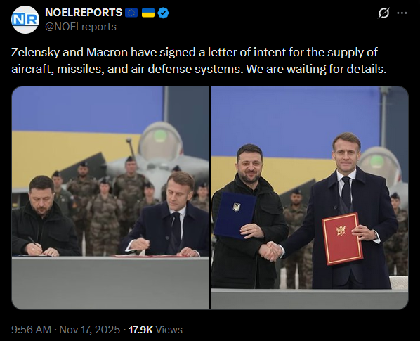SitRep - 17/11/25 - Zelensky signed a letter of intent in ParisAn overview of the daily events in Russia's invasion of Ukraine. Zelensky and Macron have signed a letter of intent for the supply of aircraft, missiles, and air defense systems.https://x.com/NOELreports/status/1990527223963807795?s=20
