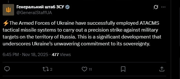 Ukrainian HUR's PRYMARY unit has struck again. Over the past two weeks, deep inside Donbas, they successfully targeted and destroyed a Tor-M1 air defense system, a 55K6 radar component of the S-400, and a 9S18M1-3 radar from the Buk-M3 complex.https://x.com/NOELreports/status/1990406984584020028?s=20https://files.catbox.moe/ur8x1b.mp4