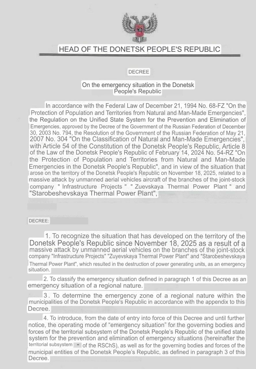 Blackouts sweep Russian-held Donetsk as Ukrainian drones cripple key power plantsUkrainian drone strikes have knocked two primary thermal power plants (TPPs) offline in the Russian-controlled Donetsk region, causing widespread energy collapse and halting critical heating and water services, occupation officials reported Tuesday.Denis Pushilin, head of the Moscow-backed Donetsk People's Republic (DPR), characterised the overnight raid on the Zuyevskaya and Starobeshevskaya TPPs as an "unprecedented attack" on the region's energy grid.Operational Impact:Infrastructure Failure: The strikes have triggered emergency shutdowns of boiler houses and water filtration stations across the region, raising humanitarian concerns as winter sets in.Scope of Outage: While Pushilin noted "many" settlements were affected, local reports indicate roughly 65% of consumers in the region—including the cities of Donetsk, Makiivka, and Horlivka—are currently without power.Targets: The Zuyevskaya TPP (1,200 MW) in Zugres and the Starobeshevskaya TPP (2,300 MW) in Novyi Svet reportedly sustain up to a third of the region's energy needs.Attribution:While Russian officials blamed the outages on general "attacks," the Ukrainian Unmanned Systems Forces claimed responsibility. Commander Robert "Madyar" Brovdi released footage on Tuesday purportedly showing drone impacts on both facilities, describing the operation as a calculated strike to disrupt logistical support for the Russian military.