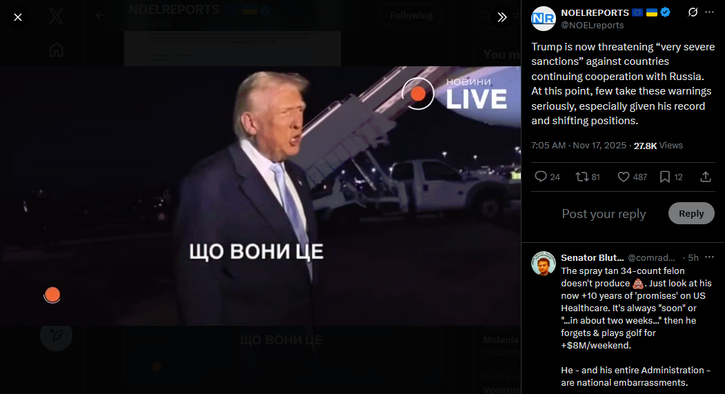 Trump is now threatening “very severe sanctions” against countries continuing cooperation with Russia. At this point, few take these warnings seriously, especially given his record and shifting positions.https://x.com/NOELreports/status/1990315231273431379?s=20