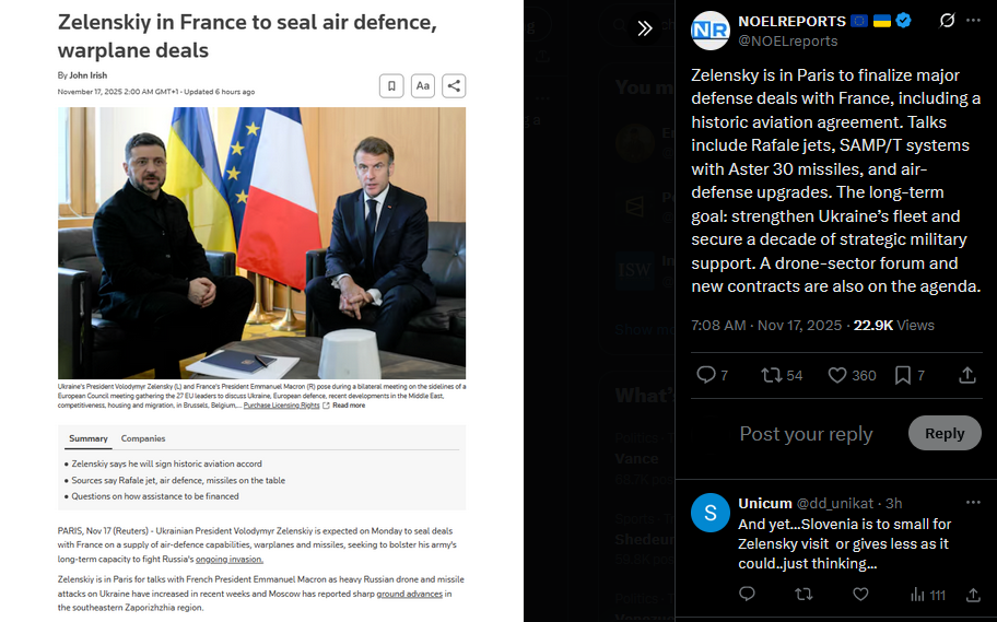 Zelensky is in Paris to finalize major defense deals with France, including a historic aviation agreement. Talks include Rafale jets, SAMP/T systems with Aster 30 missiles, and air-defense upgrades. The long-term goal: strengthen Ukraine’s fleet and secure a decade of strategic military support. A drone-sector forum and new contracts are also on the agenda.https://x.com/NOELreports/status/1990315979235086670?s=20