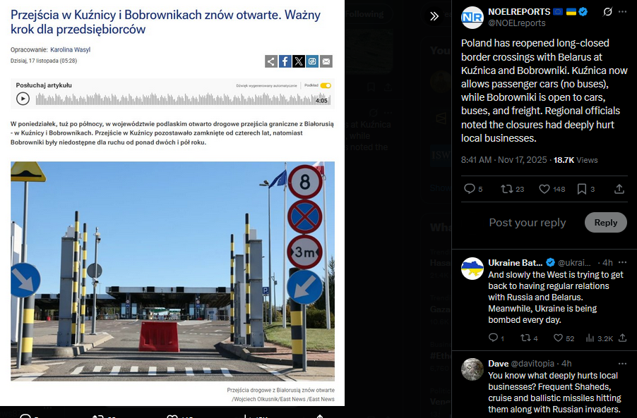 Poland has reopened long-closed border crossings with Belarus at Kuźnica and Bobrowniki. Kuźnica now allows passenger cars (no buses), while Bobrowniki is open to cars, buses, and freight. Regional officials noted the closures had deeply hurt local businesses.https://x.com/NOELreports/status/1990339454620557500?s=20