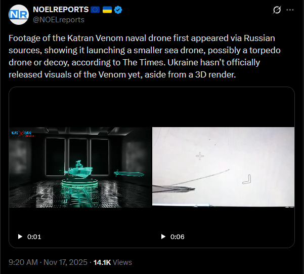 Footage of the Katran Venom naval drone first appeared via Russian sources, showing it launching a smaller sea drone, possibly a torpedo drone or decoy, according to The Times. Ukraine hasn’t officially released visuals of the Venom yet, aside from a 3D render.https://x.com/NOELreports/status/1990349316054290683?s=20video 1https://files.catbox.moe/eoa0vr.mp4video 2https://files.catbox.moe/58bxwv.mp4