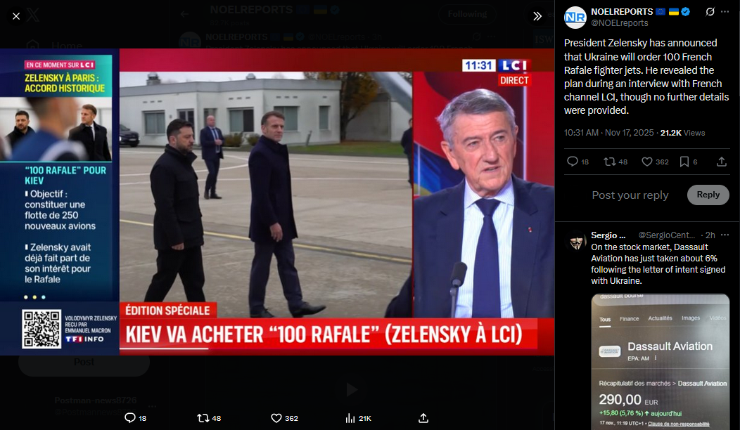 >>521699823President Zelensky has announced that Ukraine will order 100 French Rafale fighter jets. He revealed the plan during an interview with French channel LCI, though no further details were provided.https://x.com/NOELreports/status/1990367306934092283?s=20