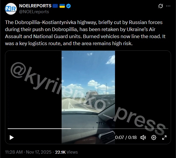 The Dobropillia–Kostiantynivka highway, briefly cut by Russian forces during their push on Dobropillia, has been retaken by Ukraine’s Air Assault and National Guard units. Burned vehicles now line the road. It was a key logistics route, and the area remains high risk.https://x.com/NOELreports/status/1990381410574598336?s=20https://files.catbox.moe/9s3yzq.mp4