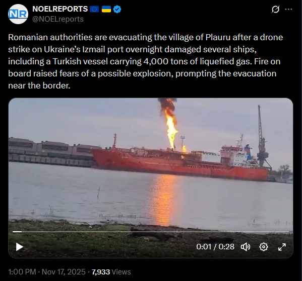 Romanian authorities are evacuating the village of Plauru after a drone strike on Ukraine’s Izmail port damaged several ships, including a Turkish vessel carrying 4,000 tons of liquefied gas. Fire on board raised fears of a possible explosion, prompting the evacuation near the border.https://x.com/NOELreports/status/1990404772562624893?s=20