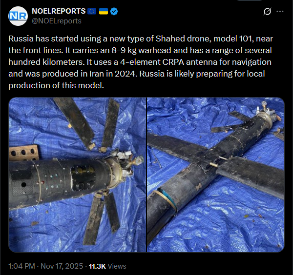 Russia has started using a new type of Shahed drone, model 101, near the front lines. It carries an 8–9 kg warhead and has a range of several hundred kilometers. It uses a 4-element CRPA antenna for navigation and was produced in Iran in 2024. Russia is likely preparing for local production of this model.https://x.com/NOELreports/status/1990405756470825269?s=20pic 1https://files.catbox.moe/ty8l6h.jpgpic 2https://files.catbox.moe/g8dl22.jpg