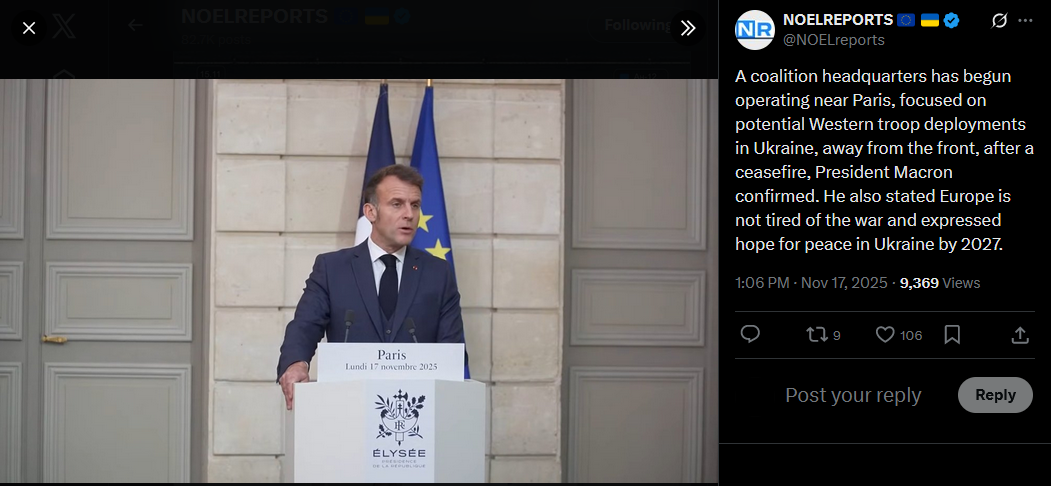 >>521700233>focusing so much on the tip?the Nose of the plane, the French nose :^3>>521700151A coalition headquarters has begun operating near Paris, focused on potential Western troop deployments in Ukraine, away from the front, after a ceasefire, President Macron confirmed. He also stated Europe is not tired of the war and expressed hope for peace in Ukraine by 2027.https://x.com/NOELreports/status/1990406109857816644?s=20