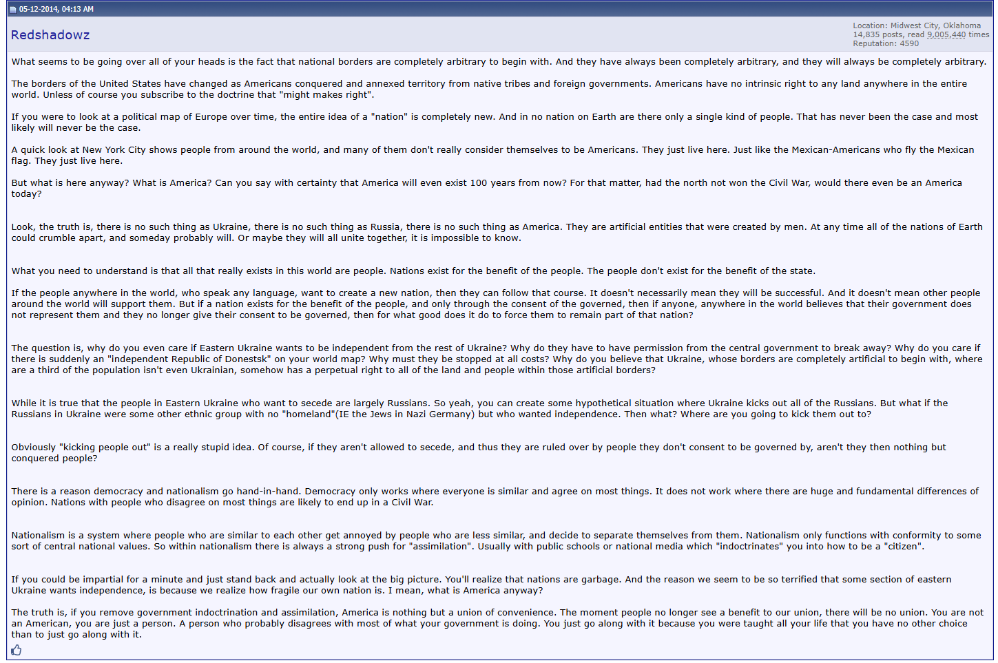 >>521679137Naa, what I'm saying is, in 2014, Ron Paul did an interview on Fox Business where he discussed the Ukraine situation. He mentioned the tens of billions America spent in Ukraine to meddle in their elections/internal politics, and about how Ukraine should probably be divided between west and east for the benefit of everyone. But instead, Ukraine fought a war against "separatists" whom it deemed "terrorists". While refusing to cede territory where it was knew everyone hated them, while trampling on everyone's rights.https://www.youtube.com/watch?v=fi575J_wYdMI made a couple posts about it on city-data at the time.Thus, in the case of morality, Russia has the high ground.But if you ignore morality and only apply realist logic, then not only was Ukraine immoral, but it was stupid. Although I don't really blame the Ukrainian people since when given a choice, they voted for peace and to protect the Russian language. But of course, they allowed a bunch of kikes to take control of their government and you can see the result.https://www.city-data.com/forum/politics-other-controversies/2191557-canada-putin-geography-lesson-learn-4.html#post36283669https://www.city-data.com/forum/politics-other-controversies/2114855-should-ukraine-deport-ethnic-russians-2.html#post34760988Pic-related was one of my posts from 2014.