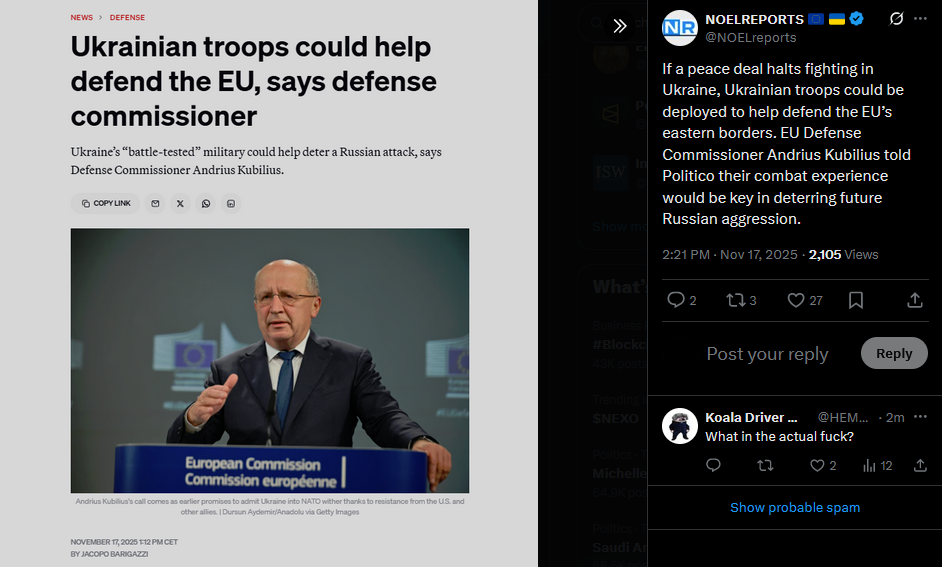 If a peace deal halts fighting in Ukraine, Ukrainian troops could be deployed to help defend the EU’s eastern borders. EU Defense Commissioner Andrius Kubilius told Politico their combat experience would be key in deterring future Russian aggression.https://x.com/NOELreports/status/1990425066912276609?s=20
