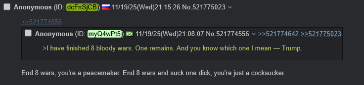 >>521781892More like i just utterly distrust rerum novarum for the insane amount of lies they have posted in the past regarding ukraine and the india/pakistan conflict and especially the iran israel war, same with clash report.But i have heard these supposed talks so many times, russia is prepared to give up kherson and zapo oblast.Then the russians say 4 oblasts or bust, it gets memoryholed and then the west after talking with themselves say russia will give up zapo and kherson oblast. Though curious how the rerum post doesnt mention dnipro oblast.Though i will keep saying it, russia is foolish for giving diplomacy a chance, USA and EU will backstab them once more, besides what could they possibly do if Russia said we demand unconditional capitulation, send troops, send the remainder of their weapons, direct intervention?
