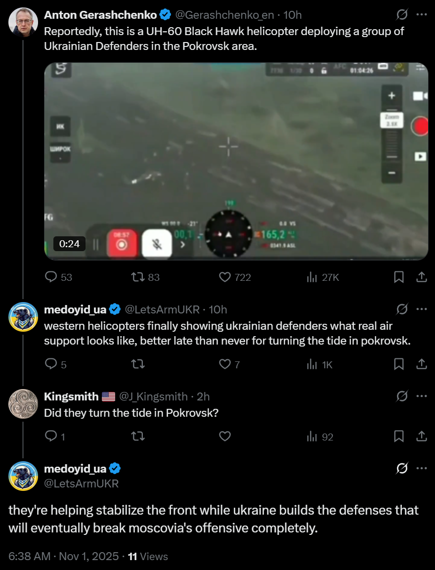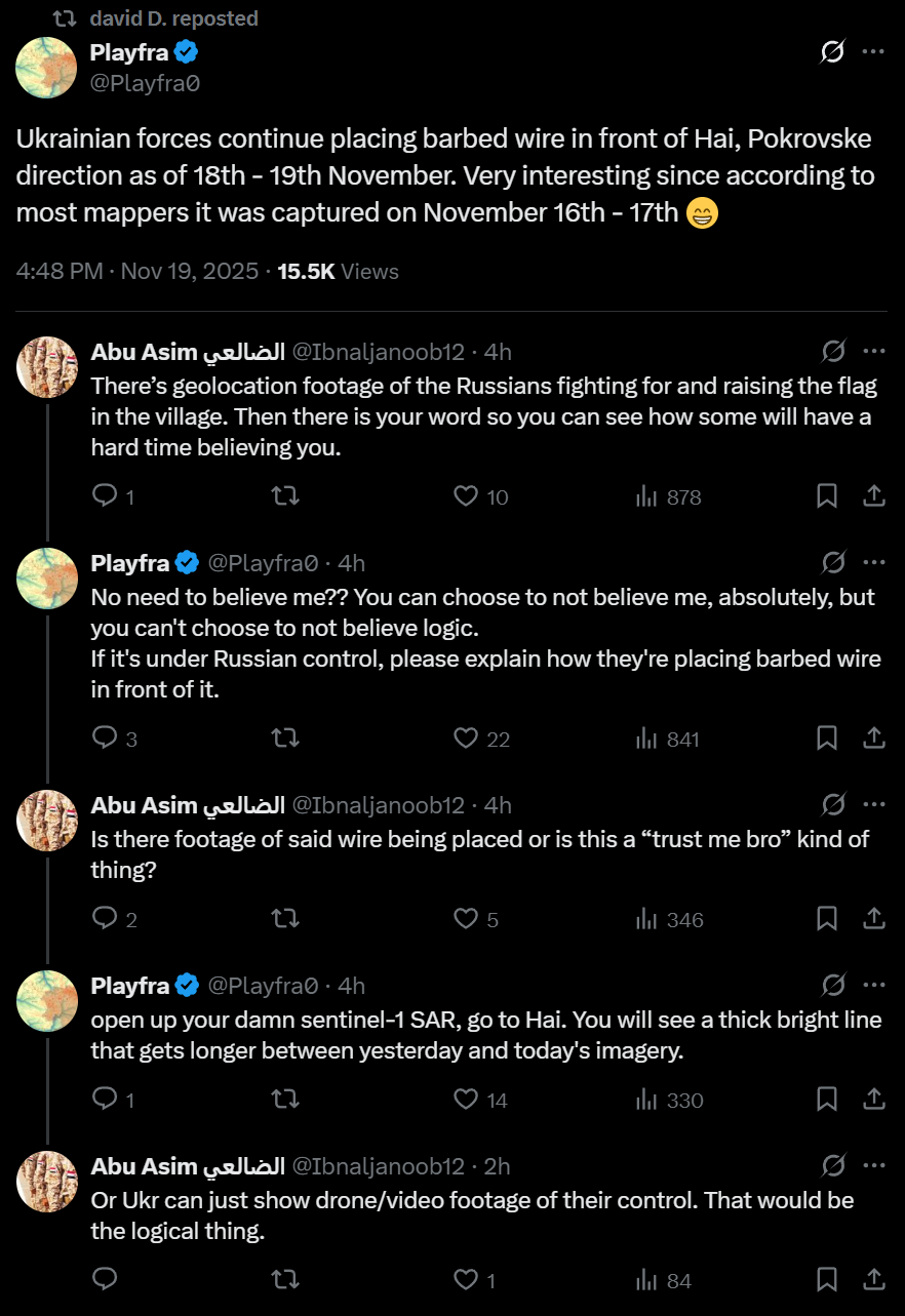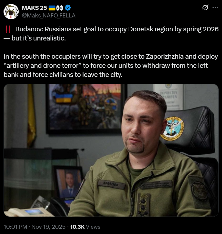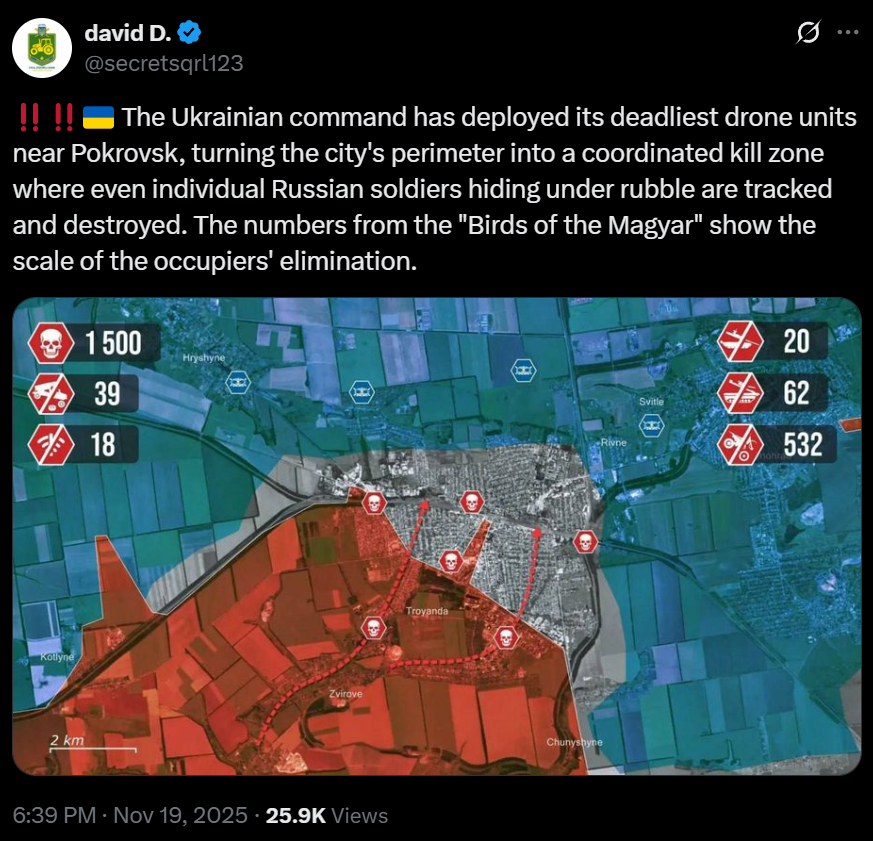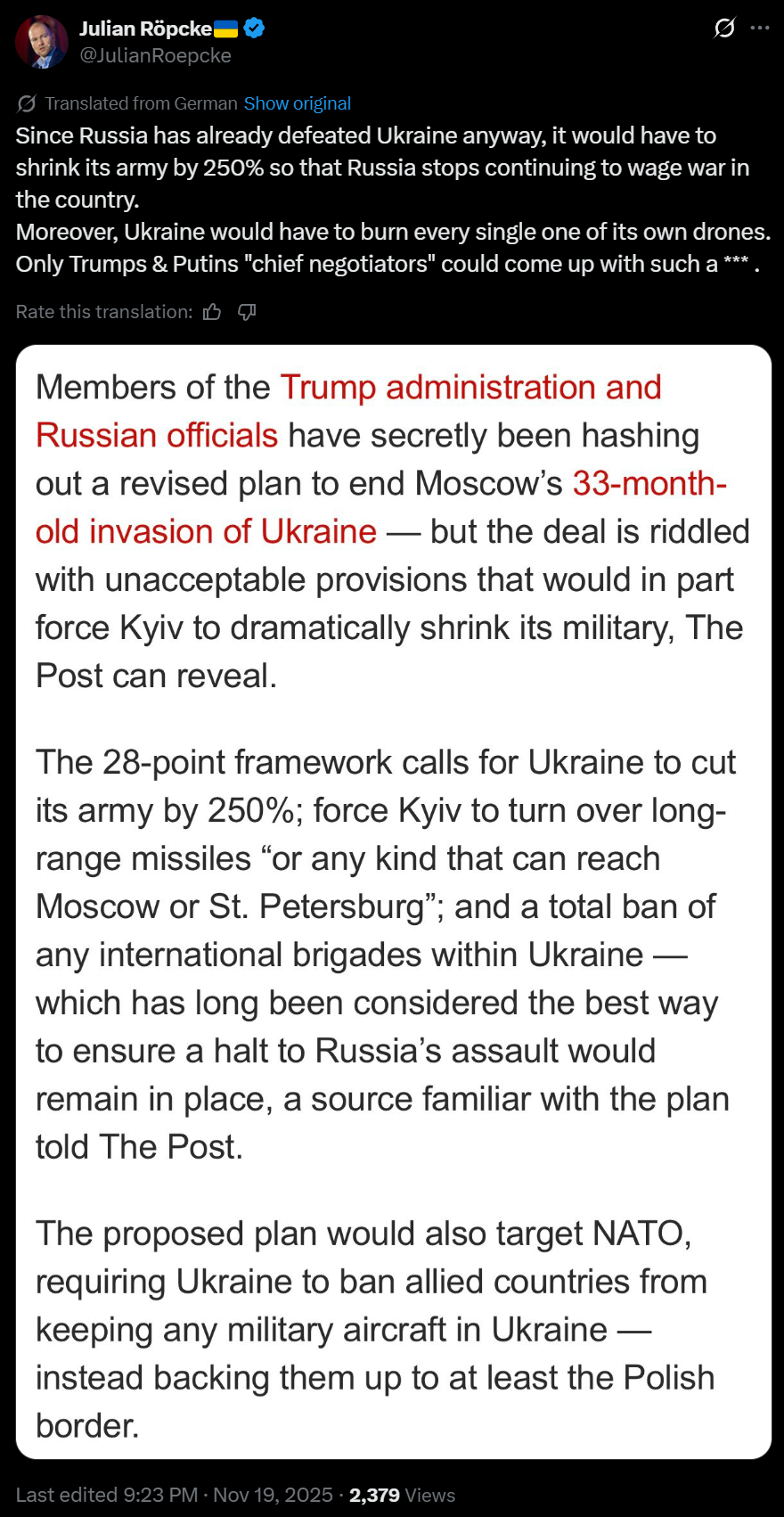 https://x.com/JulianRoepcke/status/1991225795151286656>Since Russia has already defeated Ukraine anyway, it would have to shrink its army by 250% so that Russia stops continuing to wage war in the country.>Moreover, Ukraine would have to burn every single one of its own drones.>Only Trumps & Putins "chief negotiators" could come up with such a *** .