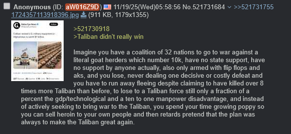 >521788039>didnt feelLet me translate: We killed 8x more Taliban than we originally claimed existed, and despite this 10 to one alleged kill rate of ours the Taliban was beating us with only 10k force against our 40k, and by the end of beating the Taliban, it had forced us to flee our base leaving behind billions of dollars worth of weapons to a Taliban that was significantly stronger, finalizing our coup de grace transwinsion.