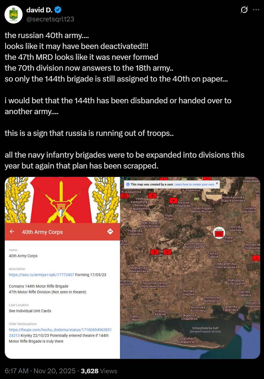 >the russian 40th army....>looks like it may have been deactivated!!!>the 47th MRD looks like it was never formed>the 70th division now answers to the 18th army..>so only the 144th brigade is still assigned to the 40th on paper...>i would bet that the 144th has been disbanded or handed over to another army....>this is a sign that russia is running out of troops..>all the navy infantry brigades were to be expanded into divisions this year but again that plan has been scrapped.