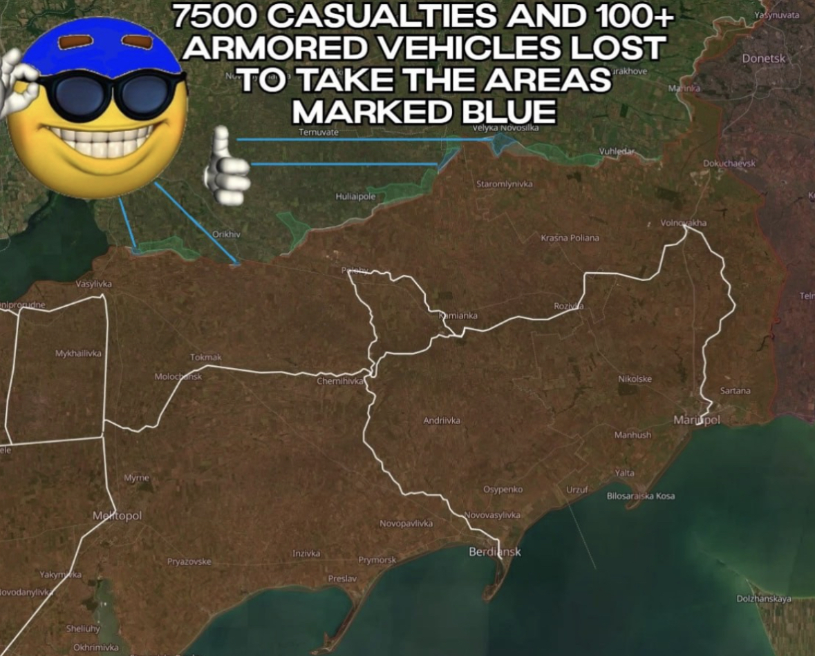 Its funny to me how the Zapad group is having more success in there Zaporozhe, Dnipropetrovsk offensive than the hohols did in 2023 despite the fact that there are now more drones and they have been moving on foot or with bikes.