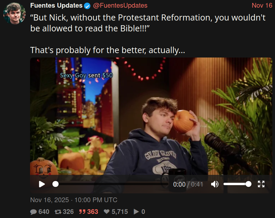 https://x.com/FuentesUpdates/status/1990178072738341360Nick Fuentes has announced people should be banned from reading the Bible unless they are Catholic priests. He states that people might misinterpret the Bible and accidentally think it opposes racial segregation