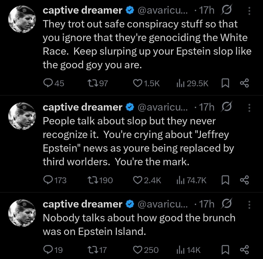 https://twitter.com/edwardlhamilton/status/1991252439949877679?s=46&t=goaRB-iS3i7SFe0_oKJ0tAMinnesota somalis funding terrorist networks in Somalia.https://twitter.com/uncorrelated_/status/1991295113344225596?s=46&t=goaRB-iS3i7SFe0_oKJ0tABunch of beaners and other hispanics classified as white in correctional systems.Shit is FUCKED fellas.