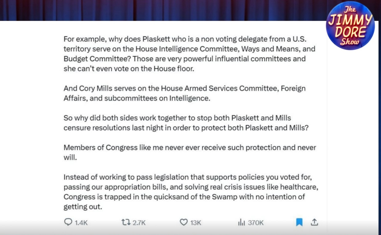 >>521898568>>521898591>>521898604>>521898617>>521898640>Lee Fang article Part 6>It remains unclear if Plaskett has fully divested herself of funds associated with Epstein. Initially reluctant to relinquish the $8,100 in direct donations, she eventually donated the money to charity. However, during her deposition, Plaskett admitted that Epstein and his associates funneled over $30,000 to her campaigns, significantly more than she donated to charity.>Plaskett, in recent years, has become a familiar voice on MSNBC, known for her bombastic partisan rhetoric and demands for ethics probes into her political opponents. Earlier this year, she sent a letter, first reported on this Substack, threatening to imprison journalist Matt Taibbi over a baseless charge of perjury.>I sent an inquiry to Plaskett’s office about the discrepancies in her claims about the relationship with Epstein and whether she will donate the money from his associates to charity. I did not receive a response.>>521898475>Read the Lee Fang articlehttps://www.leefang.com/p/house-democrat-worked-for-epsteins