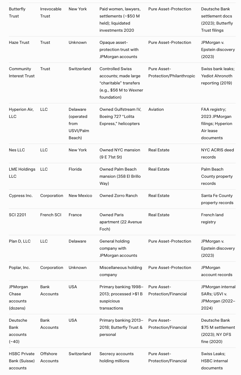 Epstein's "Trophy" Collection & Motives (1892 chars)Epstein deliberately surrounded himself with the world’s most famous/powerful as social & operational assets ("trophies"):>RoyaltyPrince Andrew (UK) – ultimate prestige; photos at Windsor/Balmoral laundered Epstein’s image post-2008 conviction.>U.S. Presidents & ex-PresidentsBill Clinton (26+ Lolita Express flights), Donald Trump (early Palm Beach social circle pre-fallout) instant credibility & protection.>Billionaires & Tech TitansBill Gates, Leon Black, Leslie Wexner (gave Epstein power of attorney over $1B+), Reid Hoffman, Sergey Brin, Jeff Bezos (social events) access to unlimited capital & private-jet networks.>Scientists/Nobel LaureatesStephen Hawking, Marvin Minsky, Murray Gell-Mann, Steven Pinker intellectual cover; Epstein funded “science” conferences on his island to look like a patron, not predator.>Hollywood & MediaHarvey Weinstein, Kevin Spacey, Woody Allen, Katie Couric, George Stephanopoulos, Charlie Rose – control over narrative & invitations.>Politicians & Power BrokersEhud Barak (former Israeli PM, dozens/visited island post-conviction), Tony Blair, multiple U.S. senators/governors, Stacey Plaskett (USVI delegate) political protection & favors.Why he collected them (per victims, ex-employees, Hoffenberg, court docs):>Prestige turned a college-dropout sex offender into a “billionaire philanthropist”>Access private jets, homes, introductions multiplied trafficking opportunities>Protection powerful friends discouraged investigations (2008 sweetheart deal)>Blackmail potential cameras everywhere; kompromat as insurance>Ego he saw himself as a puppet-master among giants>TL:DReach famous name was a shield, a door-opener, and a potential leverage point. The bigger the trophy, the safer and richer he felt.