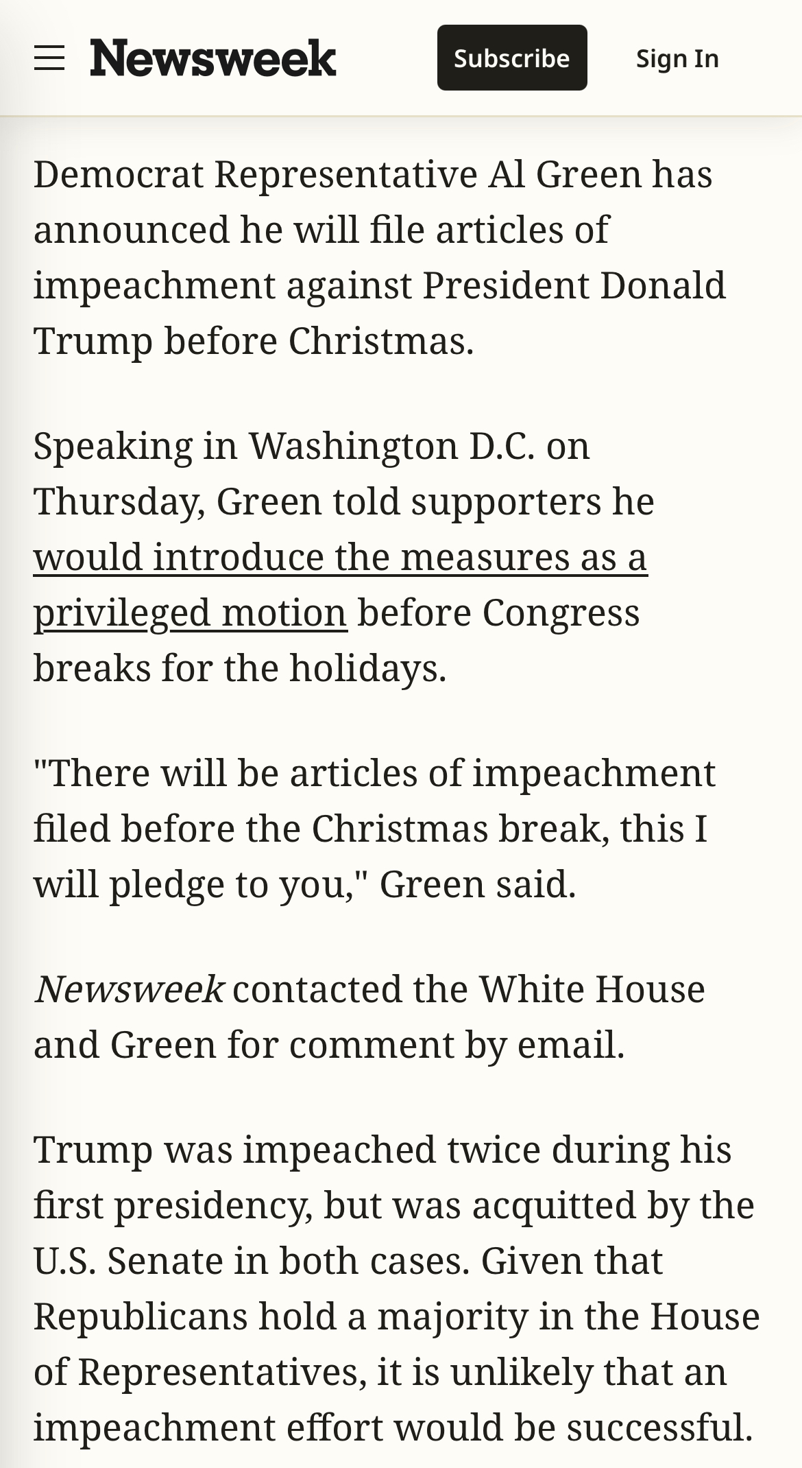 >>521914169>Democrat Representative Al Green has announced he will file articles of impeachment against President Donald Trump before Christmas.>"There will be articles of impeachment filed before the Christmas break, this I will pledge to you," Green said.https://www.newsweek.com/donald-trump-faces-articles-of-impeachment-before-christmas-al-green-11087381