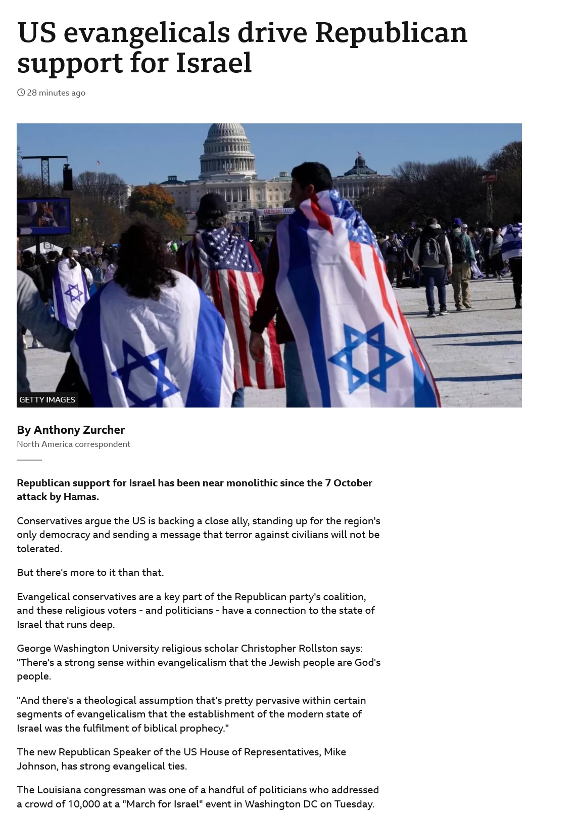 Dispensational pre-mil eschatology is what causes this. Mostly relegated to fundamentalist Baptists and charismatics. Good news is that it's a dying theological belief system, largely seen as error at best, and heresy at worst. Important to note that the majority of baptists (especially the broadly reformed) reject this belief in favor of amil, or post-mil eschatology and the younger generations are essentially unified in complete rejection of it.The amount of damage Israel has done to their theological, and international perceptions in the last few years is unreal. They really turned most of the world against them. All they've got anymore are the Western corporatist idolizers, and a small aging group of American evangelicals.. and bizarrely a significant portion of Catholic leadership apparently.. While everyone else seems to be losing sympathy for Israel, the papacy seems to be growing in it..