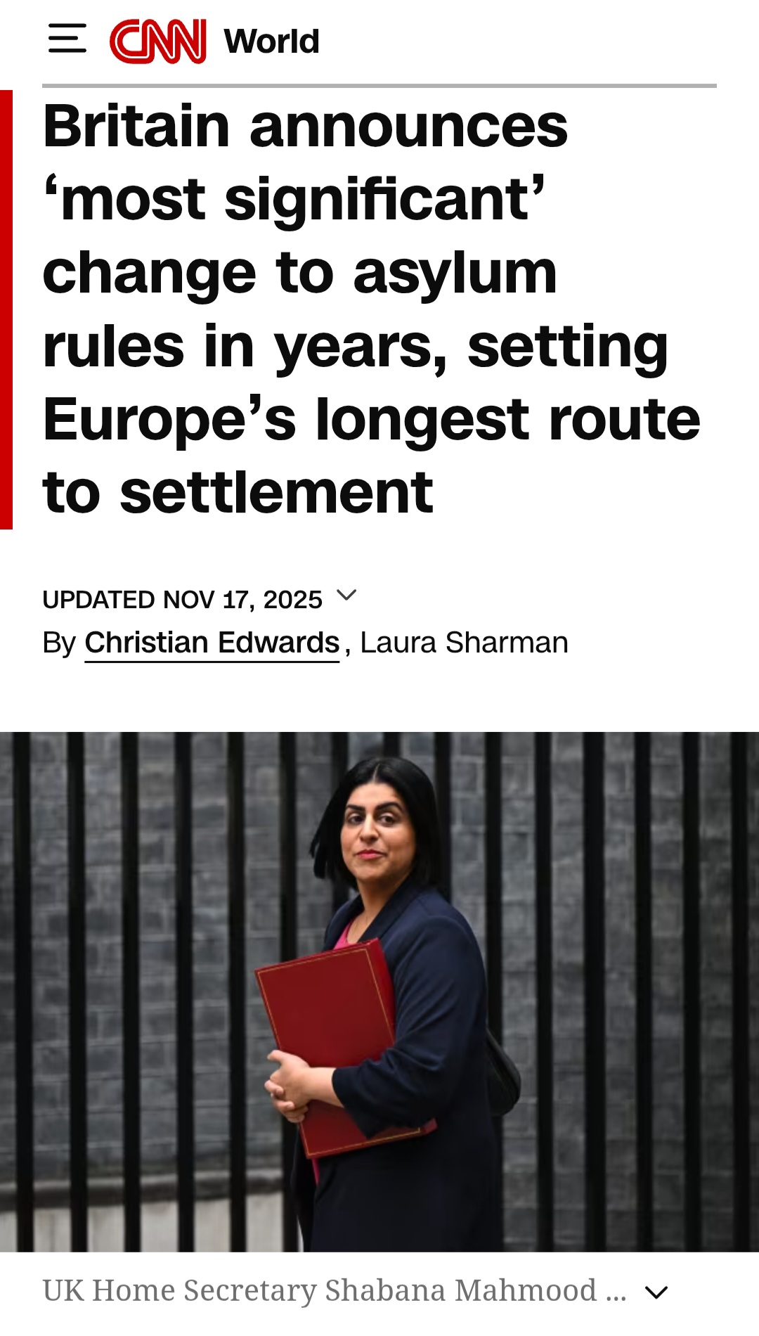 >Households face unexpected rise in energy prices in new yearhttps://www.bbc.co.uk/news/articles/c2lplg7d9ewo>Returning to London after a year in the countryside, the signs of societal collapse are everywhere - even at 7amhttps://www.dailymail.co.uk/debate/article-15311313/london-societal-collapse-amanda-williams.html>Rachel Reeves will tax us literally to death next week - see why it STILL won’t be enoughhttps://www.express.co.uk/finance/personalfinance/2136787/rachel-reeves-will-tax-us-literally-death-wont-be-enough>This Covid inquiry report is a disgrace. Shame on those who produced ithttps://archive.ph/nvMm3>UK government borrows more than expected in setback before budgethttps://www.theguardian.com/business/2025/nov/21/uk-government-borrowing-october-rachel-reeves>I’m sick of people mansplaining how to be chancellor, says Rachel Reeveshttps://www.independent.co.uk/news/uk/politics/rachel-reeves-chancellor-budget-mansplaining-b2869679.html>East London councillor who stood for Bangladesh election fails to win nominationhttps://www.standard.co.uk/news/politics/tower-hamlets-councillor-bangladesh-election-b1259096.html>NHS facing ‘huge holes’ in workforce if foreign doctors leave UK, report warnshttps://www.itv.com/news/2025-11-20/nhs-facing-huge-holes-in-workforce-if-foreign-doctors-leave-uk-report-warns
